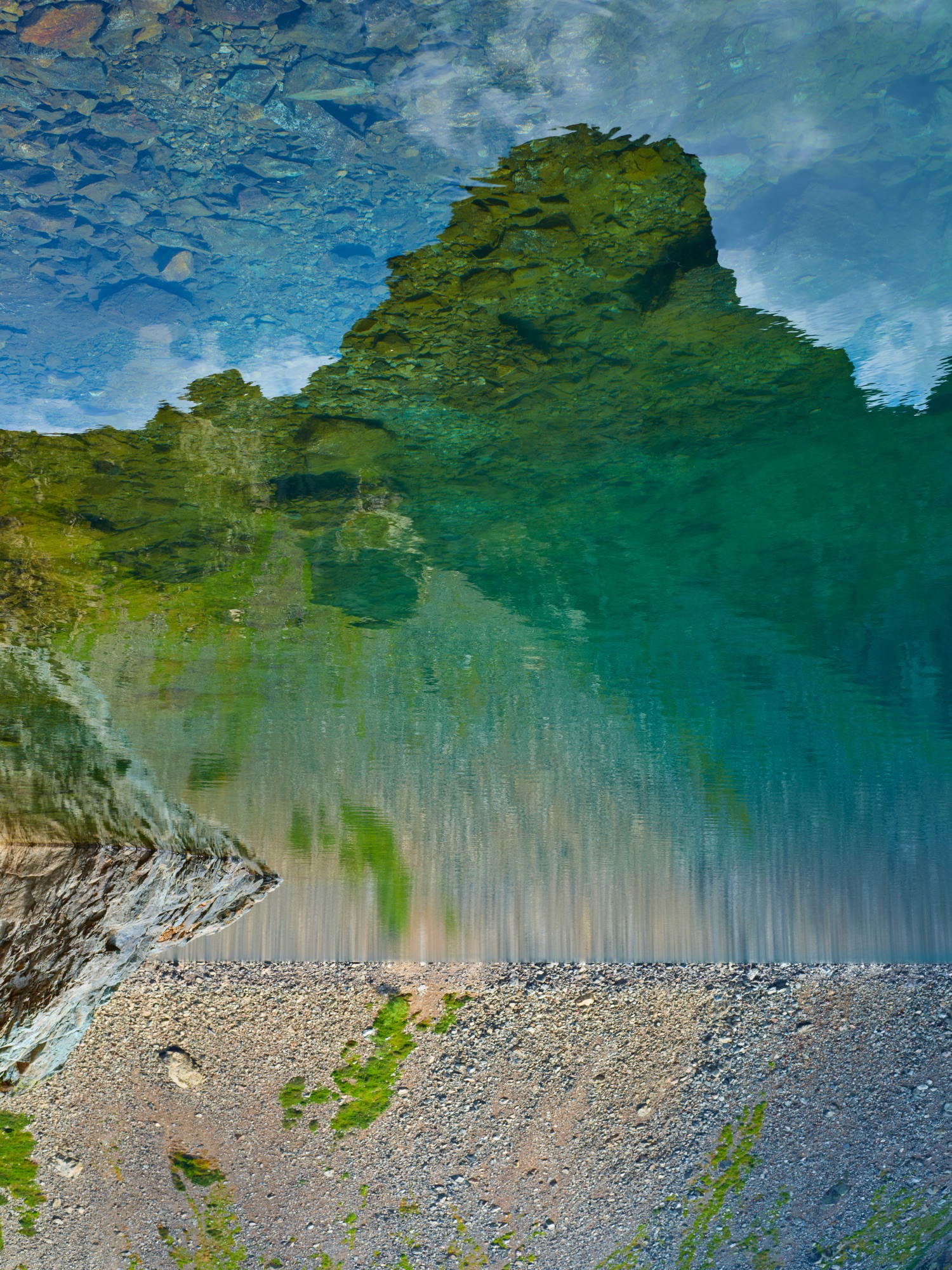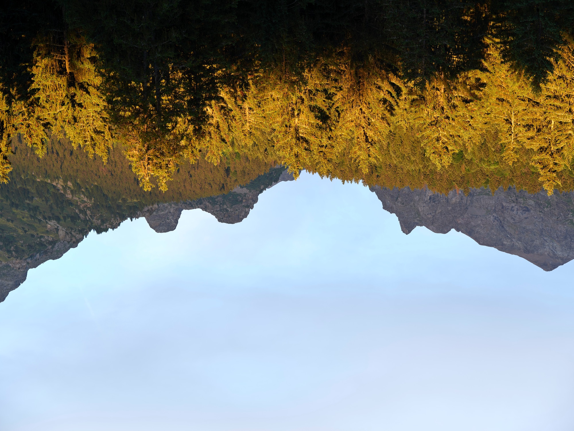 Le reflet n’est pas un simple effet optique, il devient sujet. Il trouble la lecture, invite au doute, ouvre un espace abstrait. Forêts, montagnes, ciel se transforment en formes, en masses, en couleurs. Le paysage réel et son double coexistent, sans hiérarchie, parfois jusqu’à se confondre, parfois jusqu’à s’opposer.